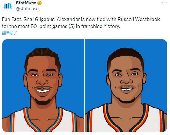 亚历山大在雷霆已经5次砍下50+,超越了杜兰特,与威少并列雷霆队史第一。此外,亚历山大前两场比赛已经获得40次罚球,排名NBA历史上前两战罚球次数第一。