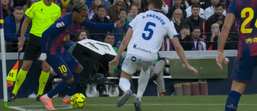 第44分钟,错失良机,亚马尔拉球后面对大半个空门将球踢在门框上