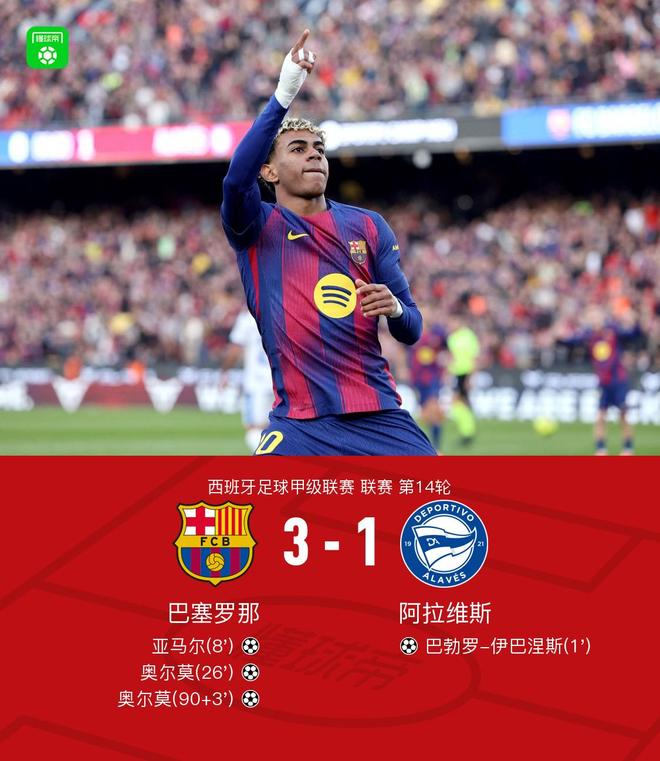 第90+3分钟,锁定胜局,亚马尔助攻奥尔莫破门,巴萨3-1阿拉维斯