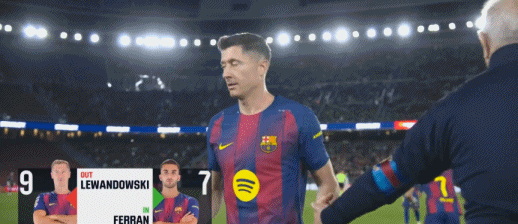 第60分钟,莱万、拉菲尼亚下,佩德里、费兰登场